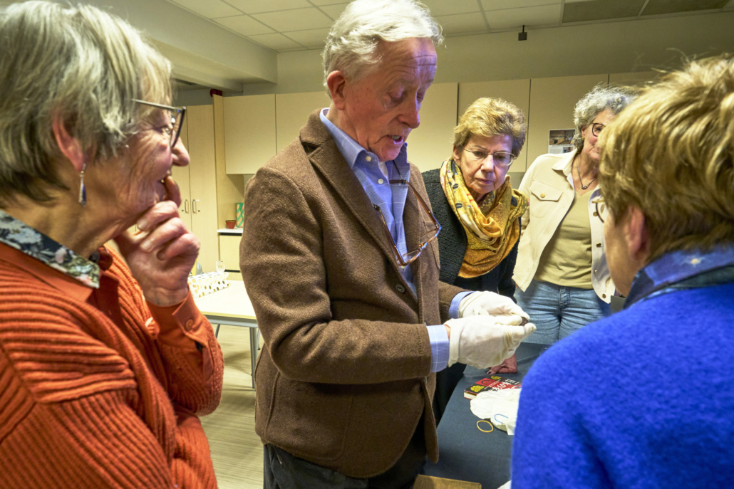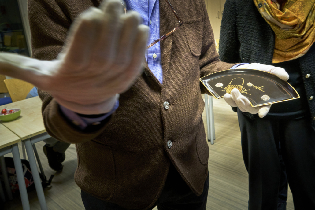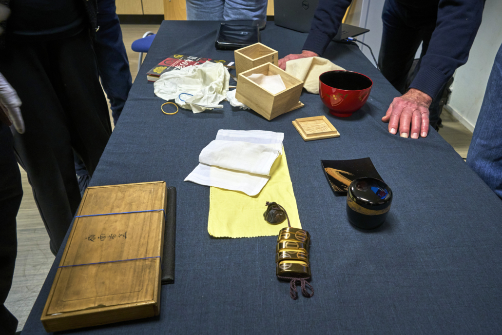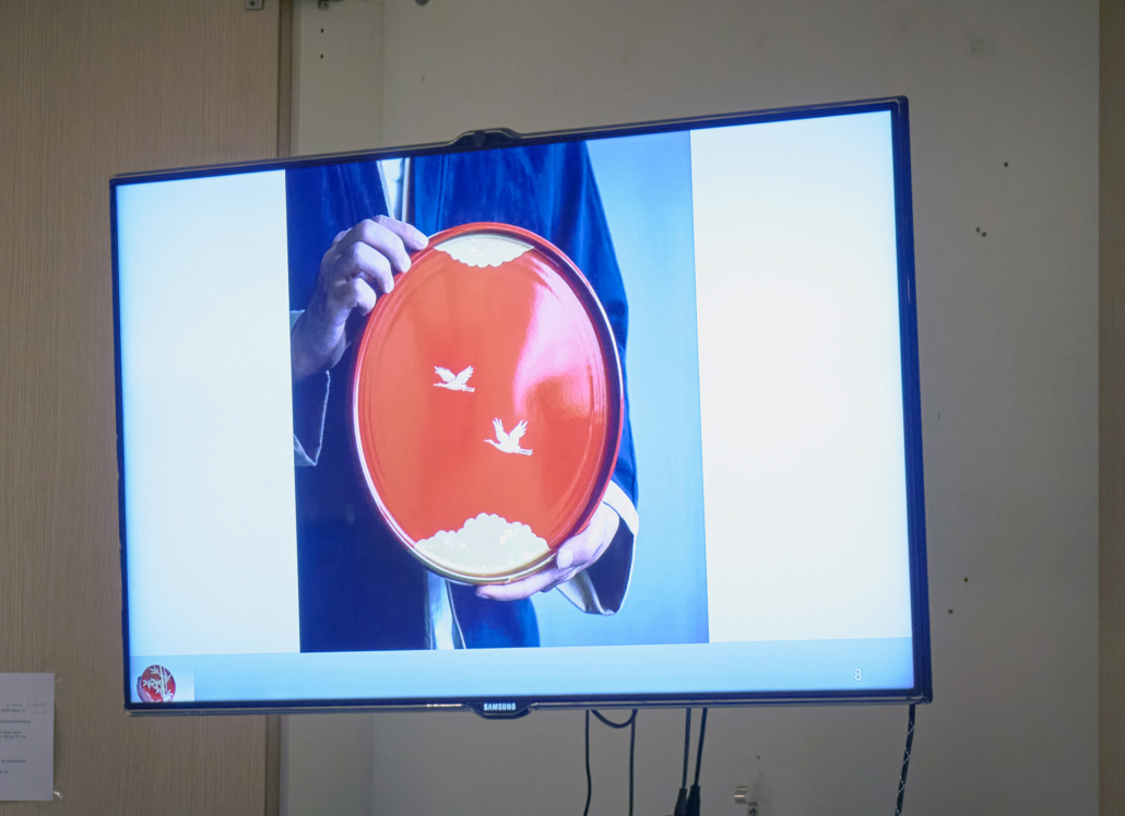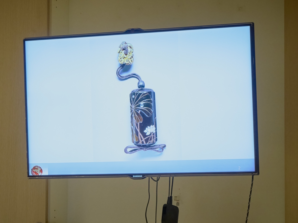 Jean ging ons uitleg geven over de Japanse laktechniek. Door middel van zelf meegenomen voorwerpen en 50 geprojecteerde foto’s, kon hij al verhalend, het één en ander aan ons duidelijk maken. Deze eeuwenoude laktechniek, werd in het begin van de zestiende eeuw bij ons in het westen bekend, door de handel van de Verenigde Oost-Indische Compagnie (VOC). Met de foto’s, die geprojecteerd werden, zagen we dienbladen, theedozen (natsume) en een mannen tabaks /pillendoosje (inro).